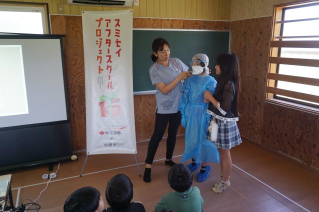 看護師のお仕事が分かってきたところで、実際に使われているガウンを着てみます!高学年の子が「着てみたい!」と、手を挙げて先生に着せてもらうと、「暑い!」と素直なコメントも。コロナ禍では、夏の暑い日でも全身防護服で検査や治療をしてくれていたと聞いて、驚きの様子です。