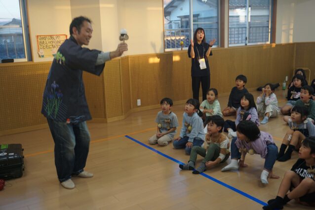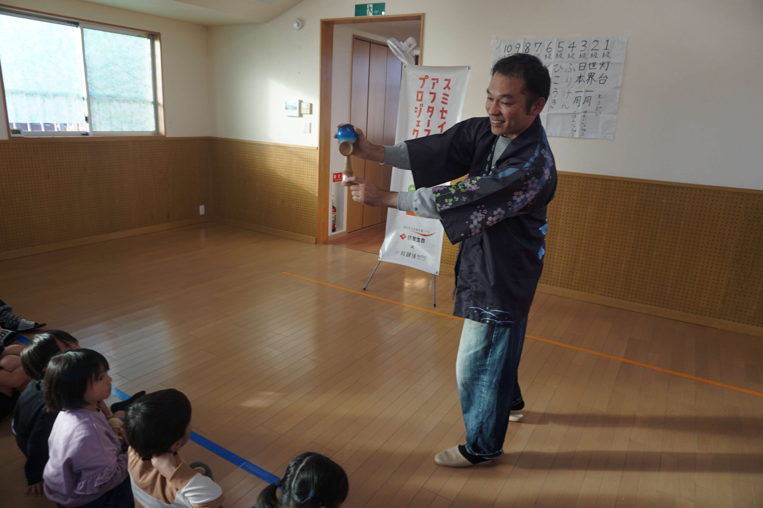 検定後は、先生からスペシャルパフォーマンスのプレゼントです!様々な形のけん玉が出てきて、みんな大喜びの様子です。