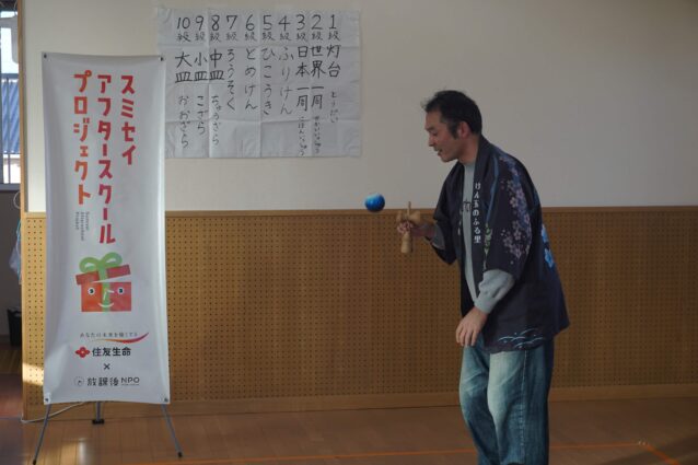 パフォーマンスを見たあとは、けん玉の持ち方やコツを改めて教えてもらいます。